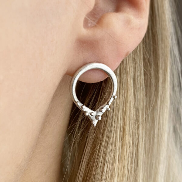 Unikalaus dizaino sidabriniai auskarai, puošti įvairaus dydžio burbuliukais.