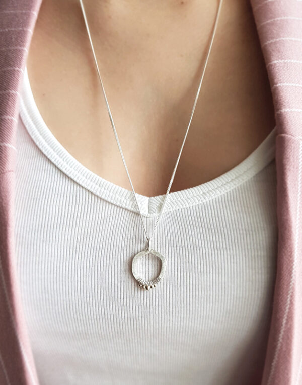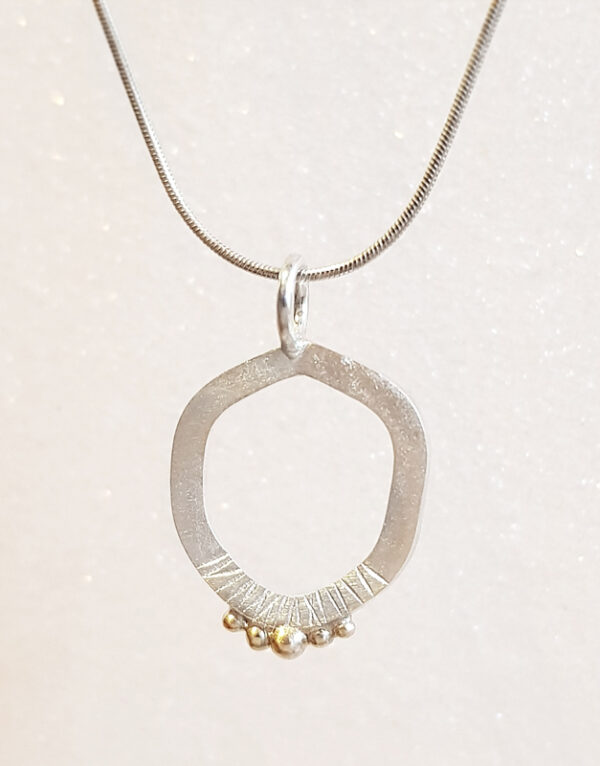 Abstraktus asimetriškas sidabro pakabukas su aukso granulėmis. Pakabukas dekoruotas matiniu, šerkšną primenančiu paviršiumi, bei kalinėta faktūra.