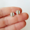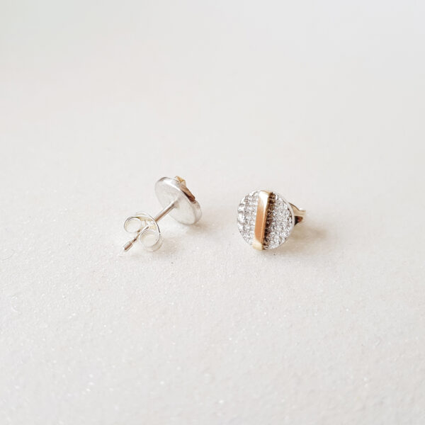 GALERIJAMinimalistiniai audinio faktūros auskarai, pagaminti iš sidabro ir puošti aukso akcentu. Puikiai tinka kasdieniam nešiojimui. Auskaro dydis apie 7,6 mm.