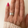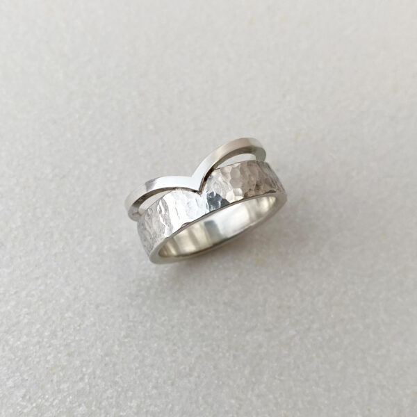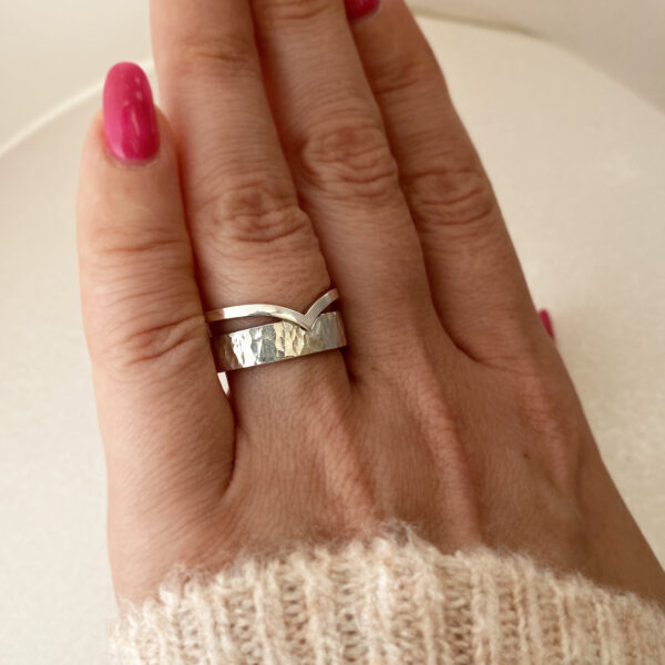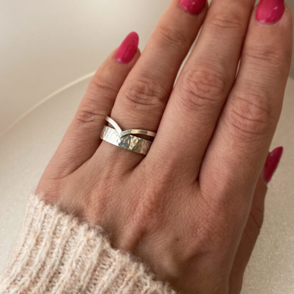 Modernus, išskirtinis sidabrinis žiedas, kurį sudaro du tarpusavyje kontrasuojantys žiedai. Taip pat galima derinti sidabrą su auksu, tuomet išgaunamas dar įdomesnis efektas (pavyzdys paskutinėje nuotraukoje).