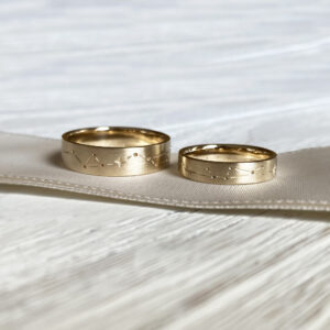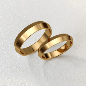 GALERIJAMinimalistiniai vestuviniai žiedai, griežtų formų. Pagaminti iš geltono aukso (585 prabos).