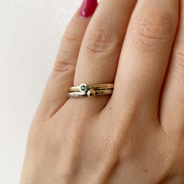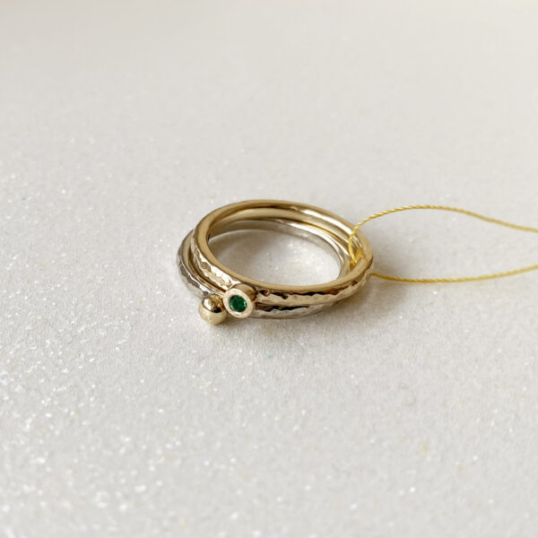 ŽIEDAIKomplektą sudaro du žiedai – balto aukso žiedas su geltono aukso burbuliuku ir geltono aukso žiedas su smaragdu (arba kitu pasirinktu brangakmeniu).