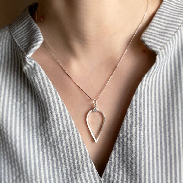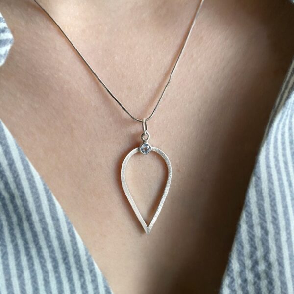 Minimalistinis lašo formos pakabukas su topazu. Viena pakabuko pusė matinio užbaigimo, kita su subtilia žvilgančia faktūra.