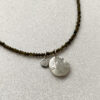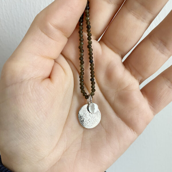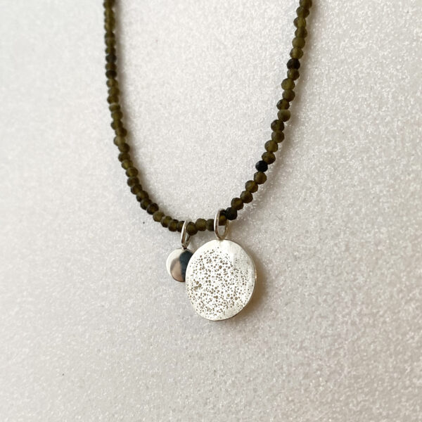 KAKLO PAPUOŠALAIObsidiano vėrinys su dviem pakabukais, vienas – akcentinis, mėnulio faktūros, kitas – mažiukas, skirtas pirmajai vardo raidei išgraviruoti.