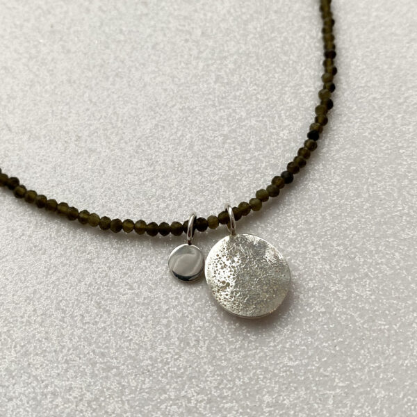 Obsidiano vėrinys su dviem pakabukais, vienas – akcentinis, mėnulio faktūros, kitas – mažiukas, skirtas pirmajai vardo raidei išgraviruoti.
