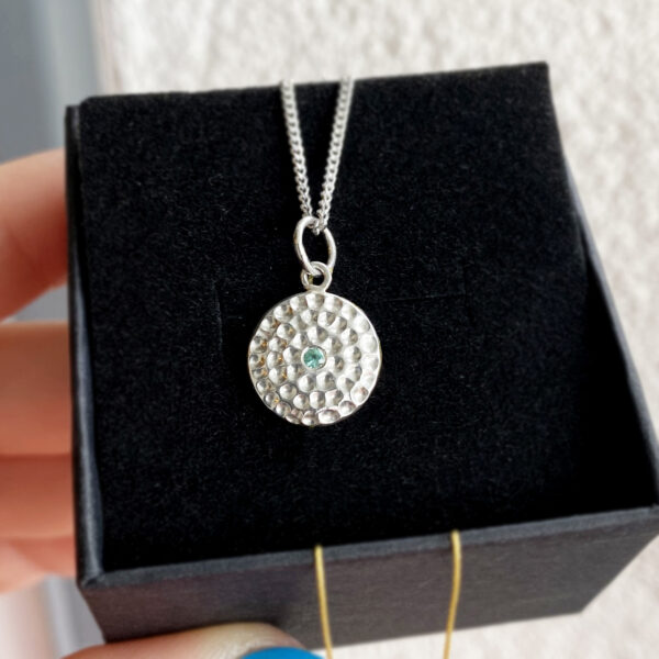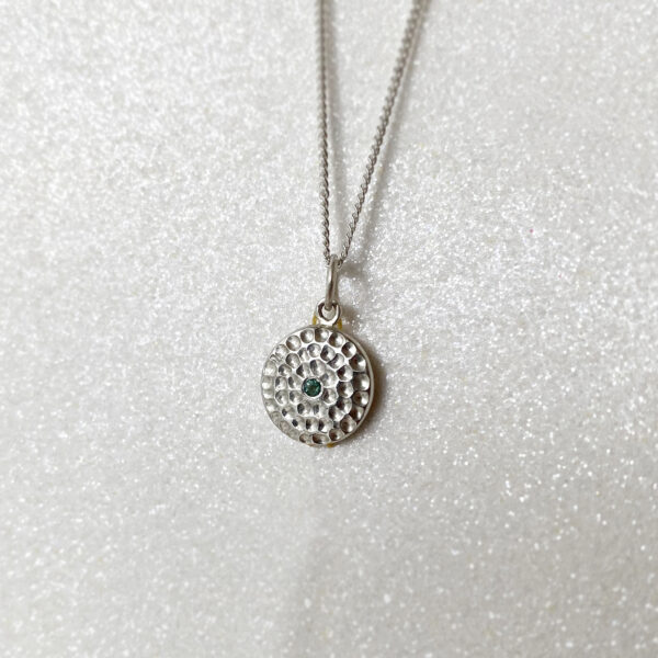 Apvalus pakabukas puoštas išraiškinga faktūra ir mažu smaragdu (gali būti ir kitas Jūsų pasirinktas brangakmenis / pusbrangis akmuo).