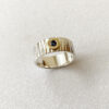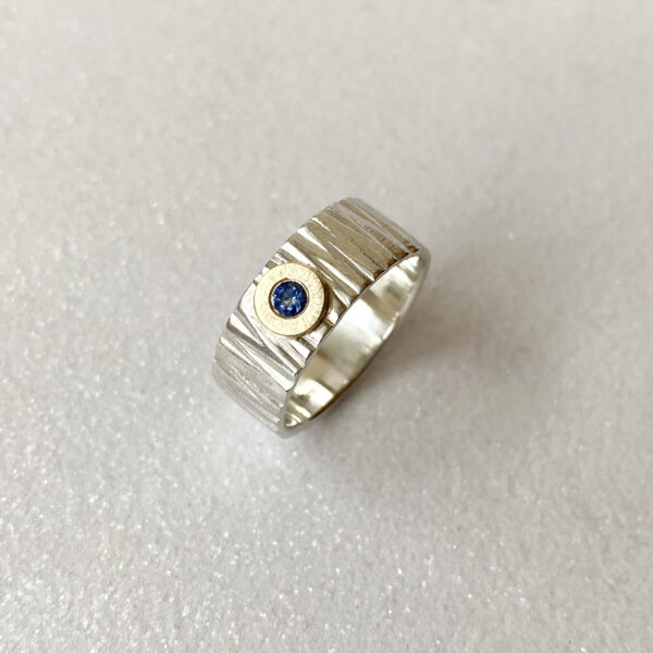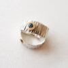 ŽIEDAIPlatus sidabro žiedas su safyru. Žiedas dekoruotas išraiškinga, chaotiška faktūra, bei aukso detale, į kurią įstatytas safyras (~2,9 mm).