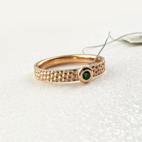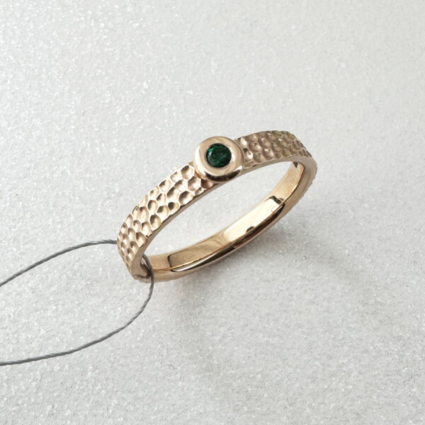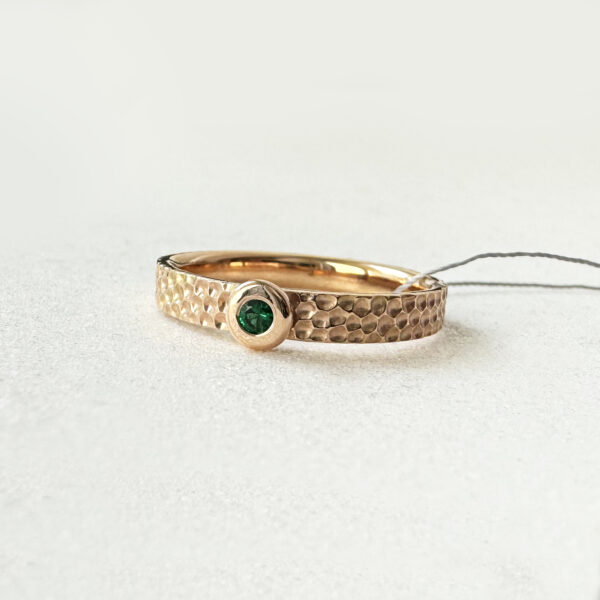 Rankų darbo žiedas su smaragdu, žiedas puoštas išraiškinga duobučių tekstūra, kuri labai gražiai žiūrisi ant piršto.