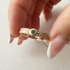 GALERIJARankų darbo žiedas su smaragdu, žiedas puoštas išraiškinga duobučių tekstūra, kuri labai gražiai žiūrisi ant piršto.
