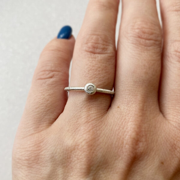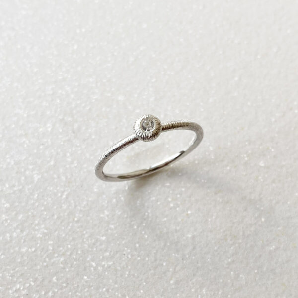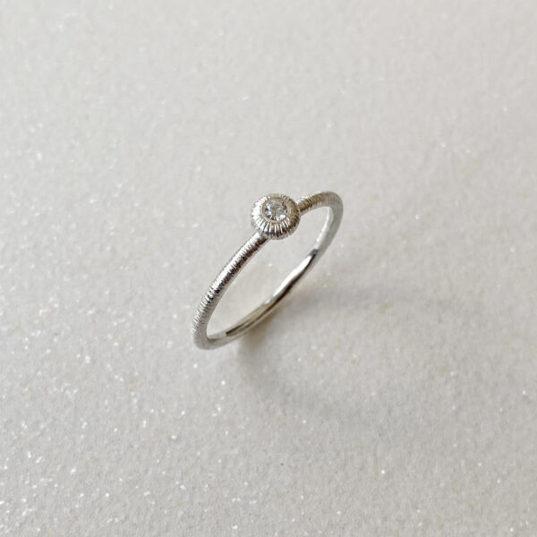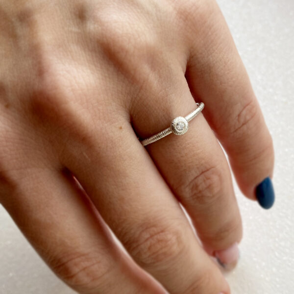 Žiedo storis 1,5 mm, žiedas puoštas subtilia faktūra. Nuotraukose 2 mm dydžio akmuo (~0,04 ct), bet galima didinti/mažinti atsižvelgiant į norimą biudžetą.