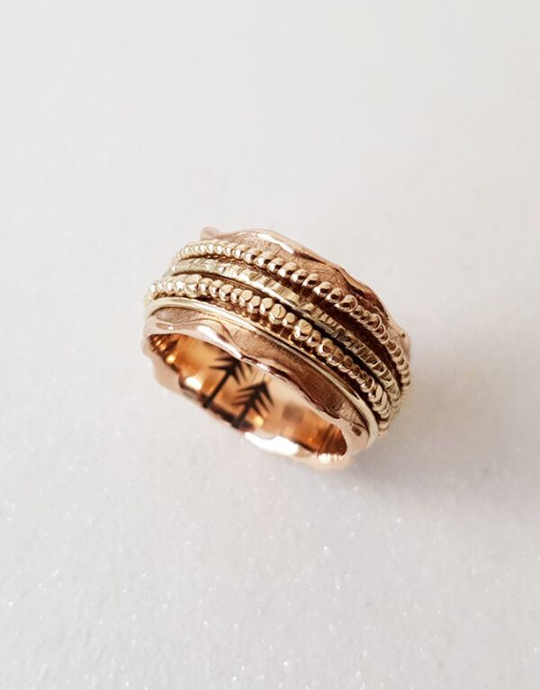 Pagrindas – platus unikalus žiedas tarsi lydytais kraštais (raudonas auksas), ant jo – keturi skirtingų faktūrų besisukantys žiedai (geltonas auksas), simbolizuojantys keturis vaikus, kiekvieno faktūra – užuomina į vaiko charakterį.