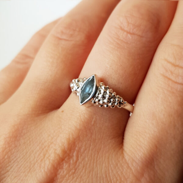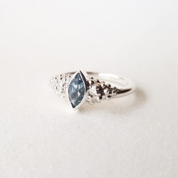 Vienetinis sidabrinis žiedas įkvėptas gamtos, su nuostabiu markizės formos Sky Blue topazu.