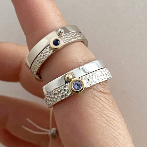 ŽIEDAIKomplektą sudaro du žiedai, vienas platesnis su duobučių faktūra ir aukso akcentu, į kurį įstatytas granatas (arba kitas pasirinktas pusbrangis akmuo), kitas žiedas plonesnis, poliruoto paviršiaus, su sidabro burbuliuku.