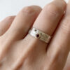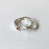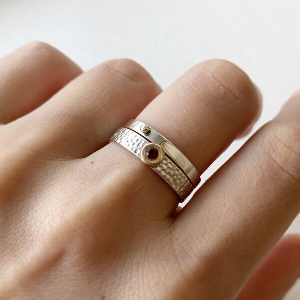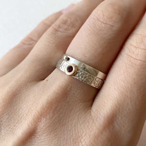 ŽIEDAIKomplektą sudaro du žiedai, vienas platesnis su duobučių faktūra ir aukso akcentu, į kurį įstatytas granatas (arba kitas pasirinktas akmuo arba brangakmenis), kitas žiedas plonesnis. poliruoto paviršiaus, su sidabro burbuliuku.